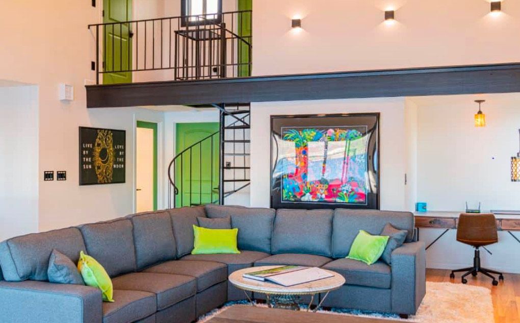 Bedroom with a black bed, headboard, and dark wood floor. A horse mural is on the wall. Best lodging in central WA
